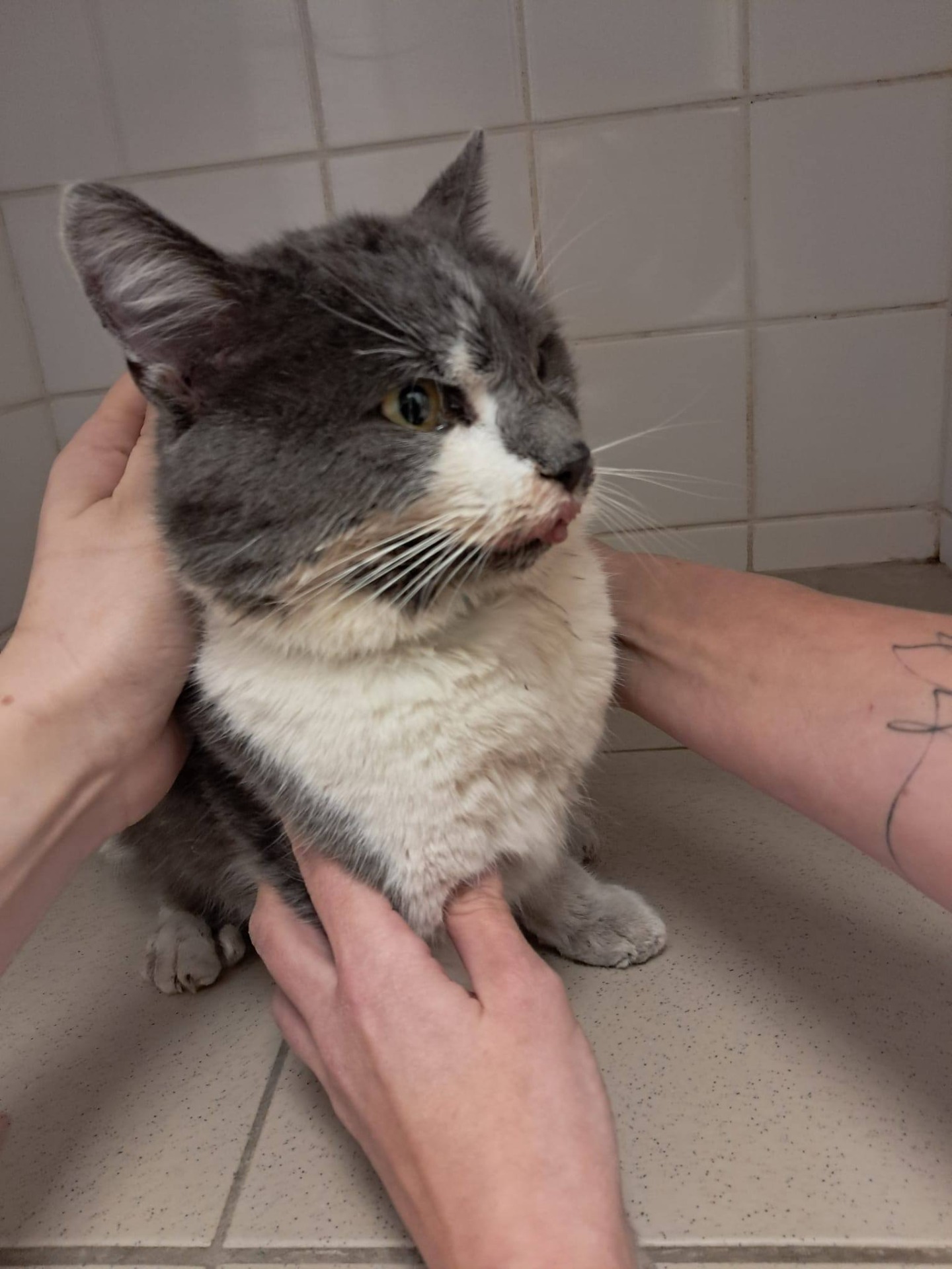 Nejdříve byl viděn na zahradě. Po týdnu si přišel pro pomoc až k domu. Nálezkyně ho předala naší dočaskářce ze sousedství. Stav kocoura byl takový, že bylo nutné ho hned dopravit na veterinu. Po vyšetření zůstal na hospitalizaci na Klinice Zbraslav. Má zavedenou kanylu, léky na bolest, už je v teple a bezpečí. Dostal jícnovou sondu.